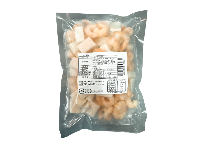 | 原材料 | むきえび(インド産、パキスタン産)、アメリカオオアカイカ(ペルー産)、食塩/調味料(無機塩等)、pH調整剤 |